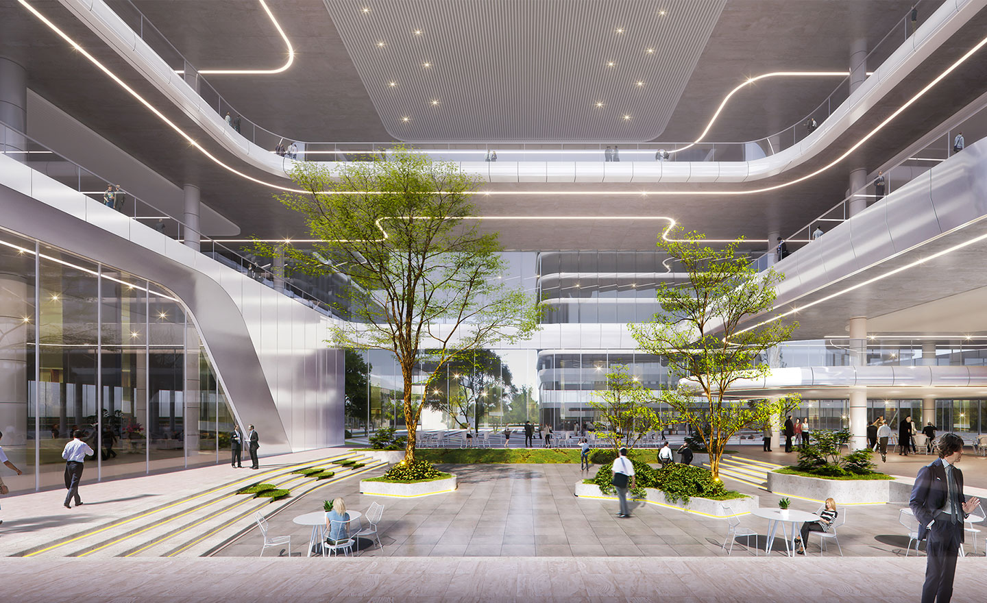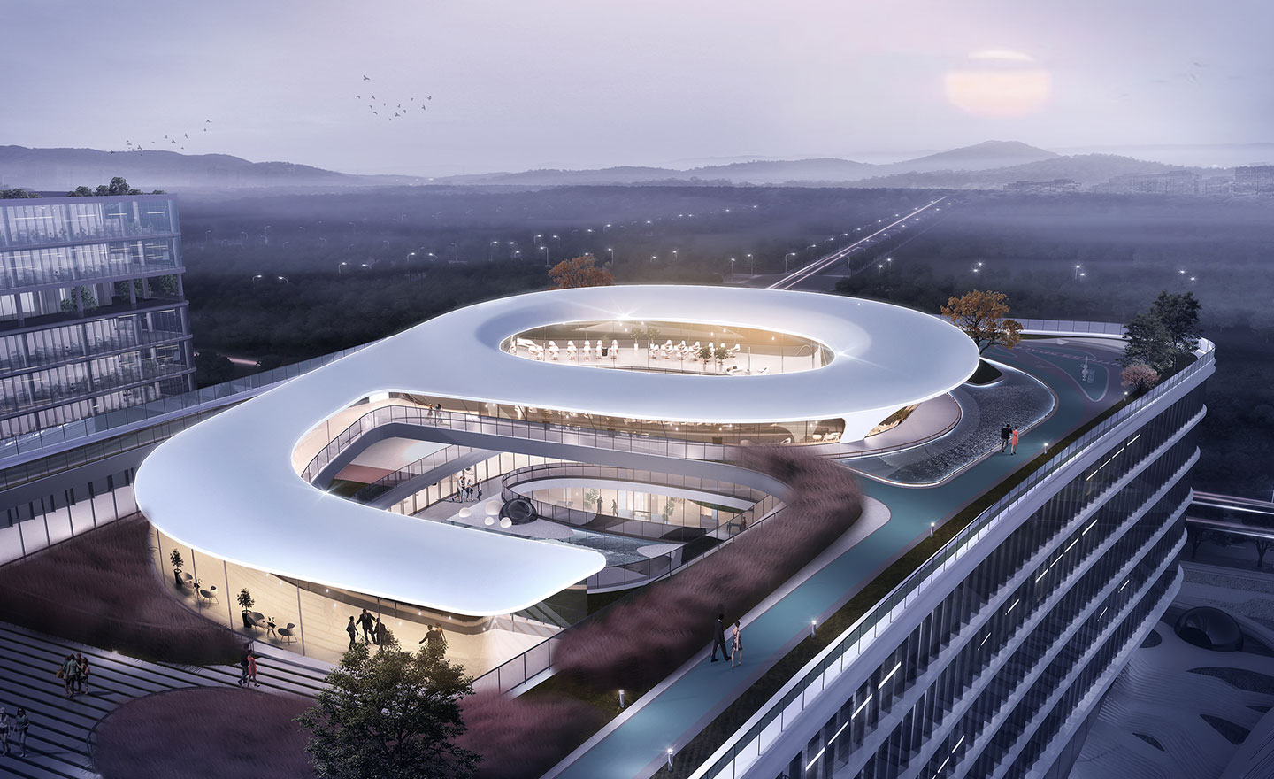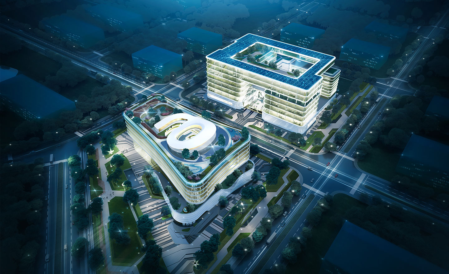 C 地塊建筑造型沒有花哨的外立面,純凈的玻璃使得建筑與景觀的隔閡消融,單一空間打破屏障,在建筑主入口便能看到臨港海水的柔美。A 地塊三個單體,公寓、倉庫、廠房,不是獨立的存在,他們由一種“芯”的力量將其融合在一起。立面自然形成計算機語言 01 代碼,高透玻璃和微晶石的組合,使得夜間燈光的變化自然形成了代碼的跳動,垂直綠化的點綴,將建筑融入自然。