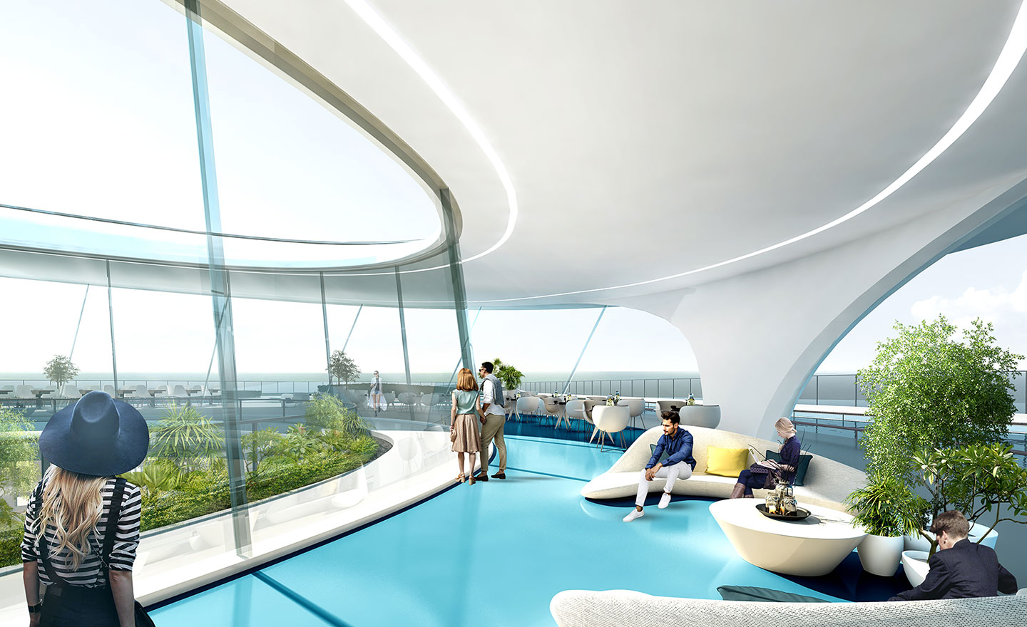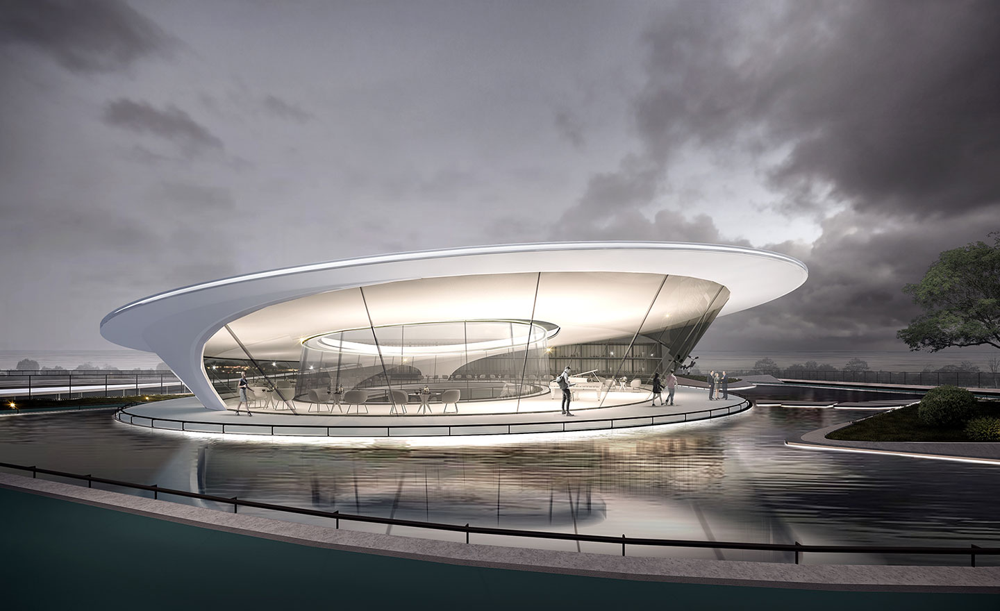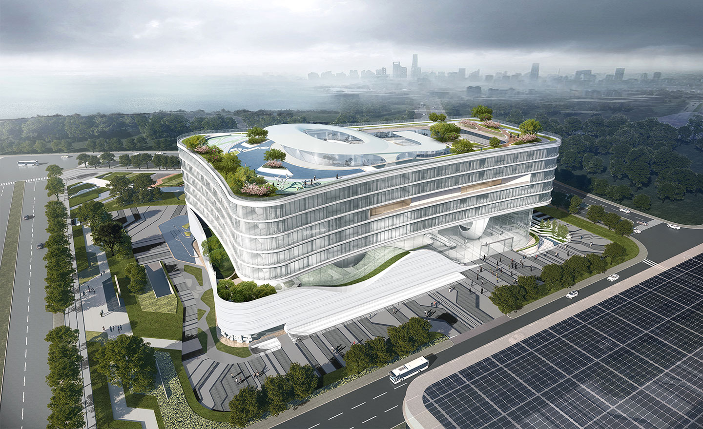 C 地塊建筑造型沒有花哨的外立面,純凈的玻璃使得建筑與景觀的隔閡消融,單一空間打破屏障,在建筑主入口便能看到臨港海水的柔美。A 地塊三個單體,公寓、倉庫、廠房,不是獨立的存在,他們由一種“芯”的力量將其融合在一起。立面自然形成計算機語言 01 代碼,高透玻璃和微晶石的組合,使得夜間燈光的變化自然形成了代碼的跳動,垂直綠化的點綴,將建筑融入自然。