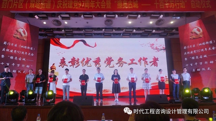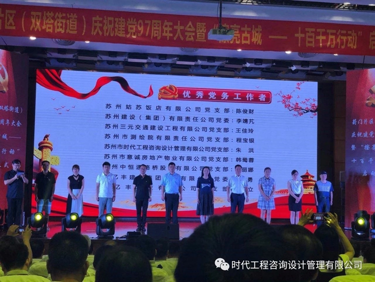蘇州市時代工程咨詢設計管理有限公司黨支部組織委員朱洪在會上榮獲“優秀黨務工作者”榮譽稱號的表彰。