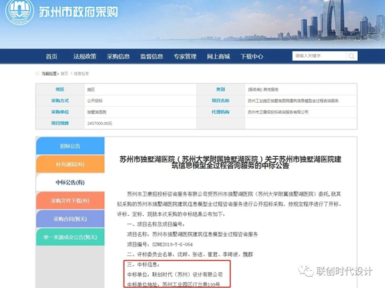 近日,聯創時代(蘇州)設計有限公司BIM研究中心在蘇州市政府采購項目中成功中標蘇州市獨墅湖醫院建筑信息模型(BIM)全過程咨詢服務。本項目是聯創時代BIM繼江西省九江市第一人民醫院、廣東省東莞人民醫院后再次中標的三級綜合醫院BIM咨詢服務項目。