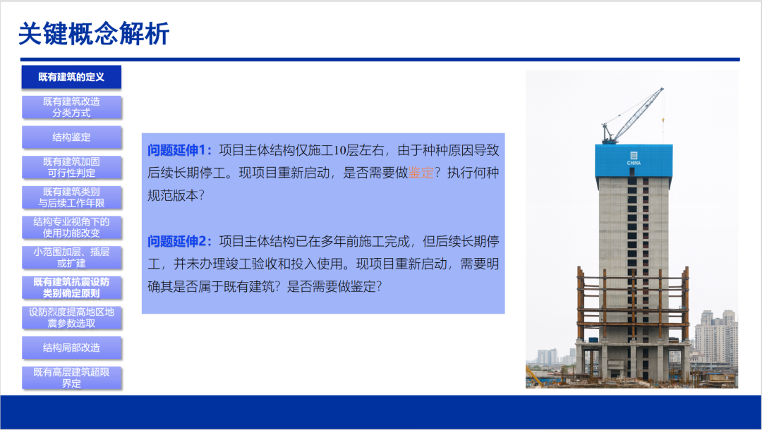 (2)關(guān)鍵概念解析:包括既有建筑的定義,既有建筑改造方式分類,結(jié)構(gòu)鑒定,既有建筑加固可行性判定,既有建筑類別與后續(xù)工作年限,結(jié)構(gòu)專業(yè)視角下的使用功能改變,小范圍加層、插層或擴建,如何確定既有建筑抗震設(shè)防類別,設(shè)防烈度提高地區(qū)地震參數(shù)選取,結(jié)構(gòu)局部改造,既有高層建筑超限鑒定等